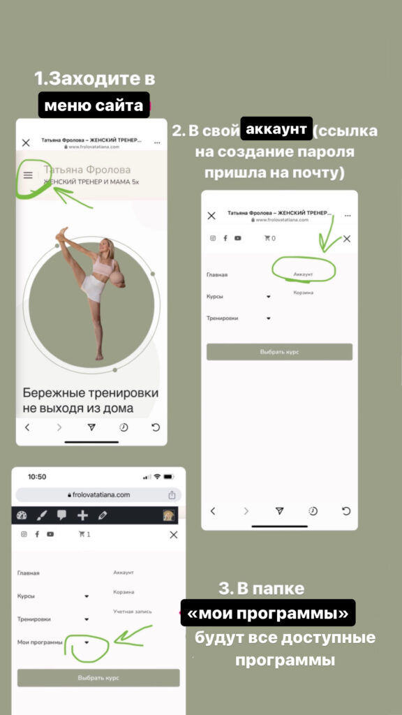 После того как вы совершите покупку на сайте, вы получите на почту письмо со сменой пароля (может быть в спаме). Администратор вас одобрит (так быстро как сможет) и тренировки будут вам доступны. В меню сайта выберете «мои программы». В ней будут все доступные вам программы.